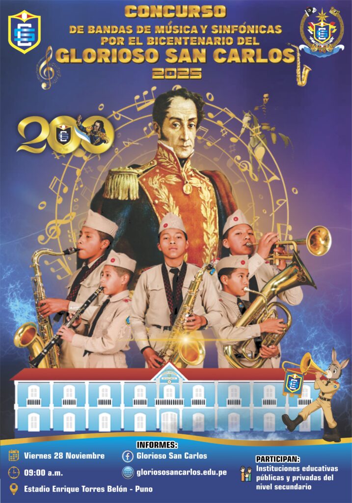 «El Concurso de Bandas Escolares 2025, en honor al Bicentenario del Glorioso Colegio Nacional de San Carlos de Puno, se llevará a cabo el 28 de noviembre. Un evento que reunirá a las bandas de música y sinfónicas de colegios para celebrar su legado musical y educativo.»