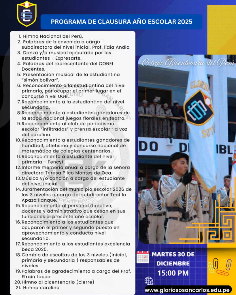 Inicio/Comunicados/CLAUSURA DEL AÑO ESCOLAR – 2025. Comunicados CLAUSURA DEL AÑO ESCOLAR – 2025. 152 Menos de un minuto 152 Menos de un minuto Compartir Facebook X LinkedIn Tumblr Pinterest Reddit VKontakte Odnoklassniki Pocket Skype Messenger Messenger WhatsApp Telegram Viber Line Compartir por correo electrónico Imprimir